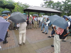 妙見口駅(200m)~黒川駅(ケーブル下駅)(240m)==ケーブル山上駅(470m) ~ふれあい広場~リフト妙見山~山頂バス停(620m)~本堂参拝(650m)~ ふれあいの広場(510m)(集合写真:時間調整)~バーベキュー会場~ケーブル 山上駅==黒川駅~妙見口駅(解散) 注:“~”:徒歩、“==”:ケーブル |